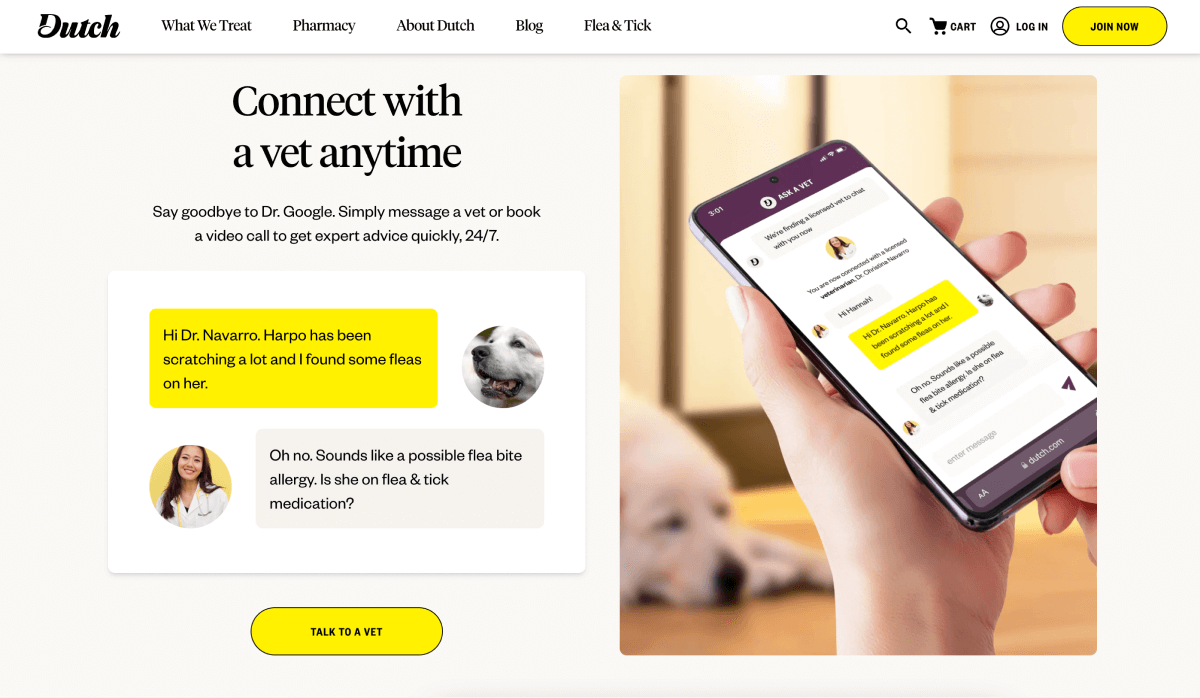 Dutch connects pet owners with veterinarians 24/7 by providing an online platform for vet care and prescriptions.