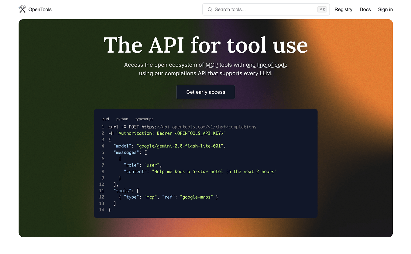 OpenTools is a registry of MCP servers to augment your LLM, letting you access the ecosystem of MCP tools with one line of code.